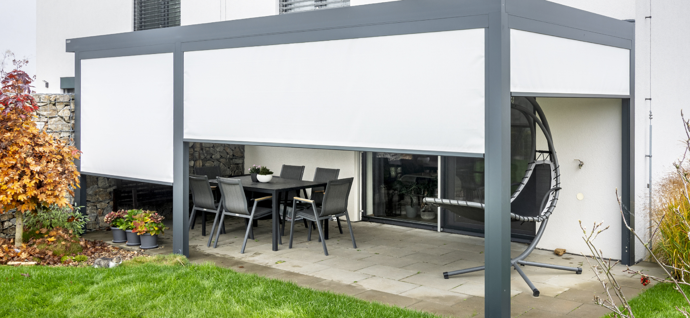 Outdoor Stoffrollos sind eine ideale Stoffrollos außen als Beschattungslösung für Einfamilienhäuser, wo LOMAX die meisten Installationen durchführt. Dank ihrer Eigenschaften werden sie auch gerne als Außenrollos für Pergolen eingesetzt .